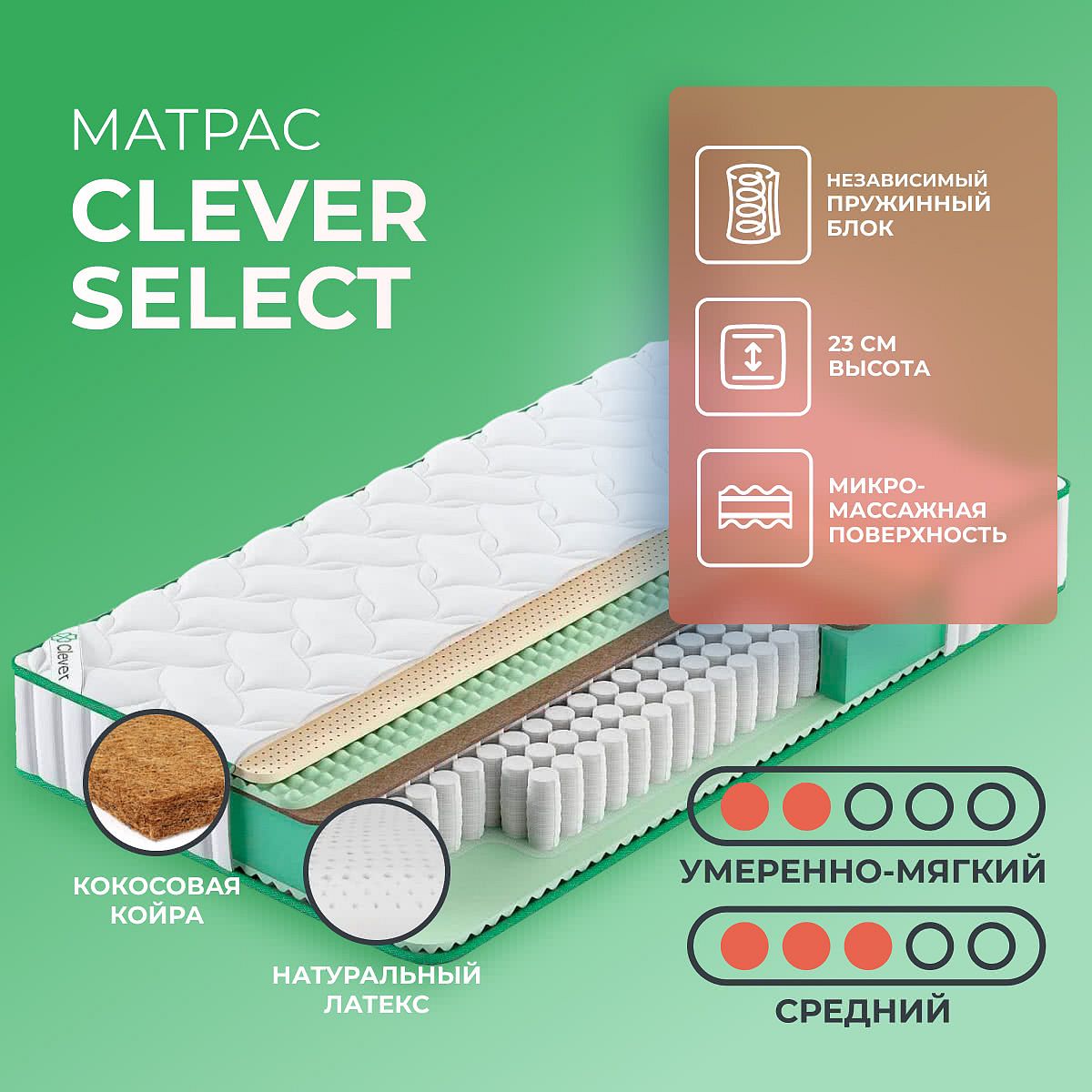 Кокос — натуральный материал, койра отлично дышит, придает матрасу «Select» жесткость и упругость.