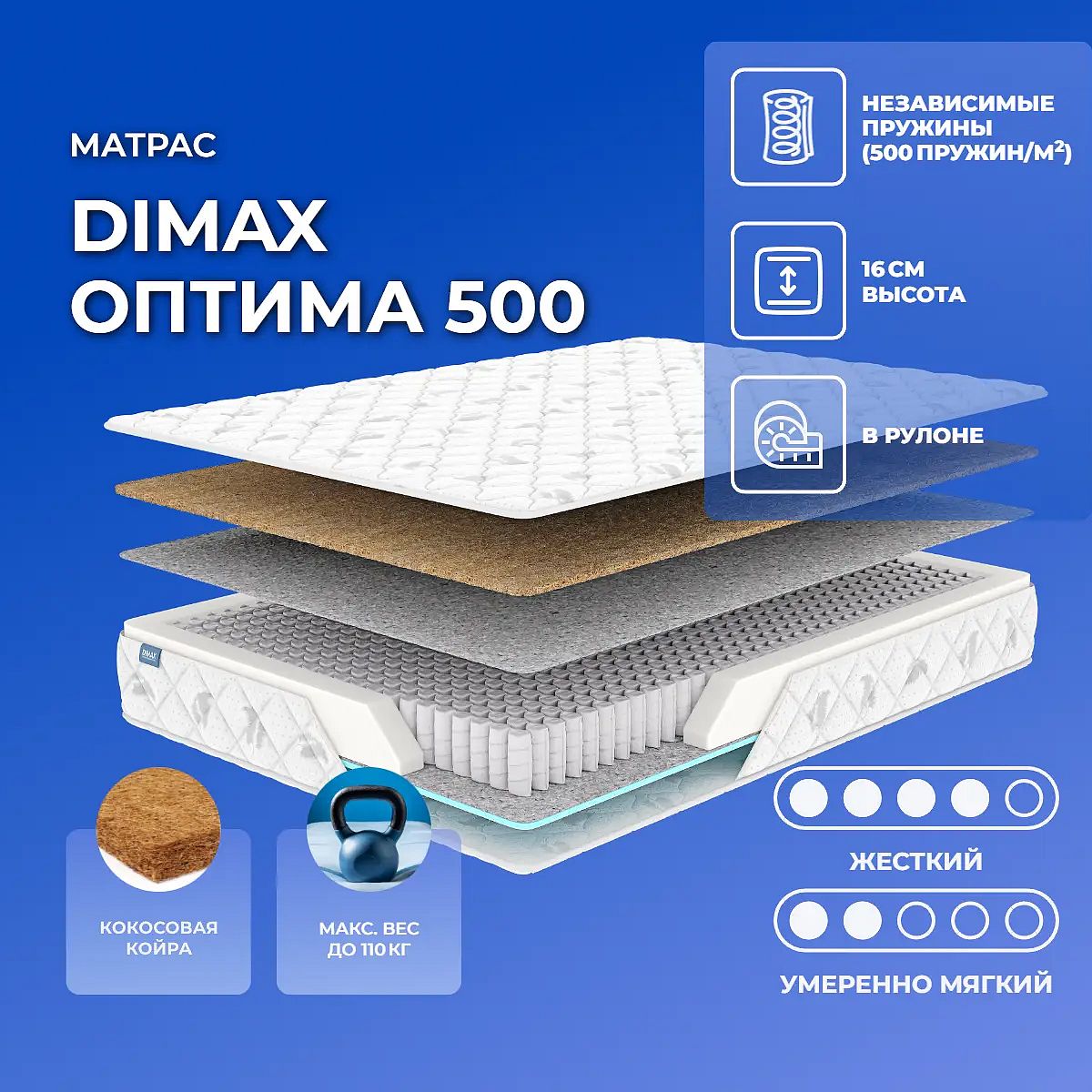 Матрас Dimax Оптима 500 — это качественный пружинный матрас с разной степенью жесткости сторон, который подойдет для ежедневного использования и обеспечит базовый комфорт сна. Одна сторона матраса — жесткая за счет слоя натурального кокоса, вторая — умеренно мягкая благодаря эластичной пене (ППУ). Независимый пружинный блок S1000 с плотностью 500 пружин на м2 обеспечивает точечную поддержку тела и способствует правильному положению позвоночника во время отдыха. Высота матраса составляет 16 см, максимальная нагрузка — до 110 кг на спальное место. Несъемный чехол выполнен из приятного на ощупь трикота, простеганного на синтепоне, что придает поверхности аккуратный внешний вид и дополнительный комфорт. Матрас поставляется в скрученном виде, что удобно для транспортировки и хранения. Характеристики