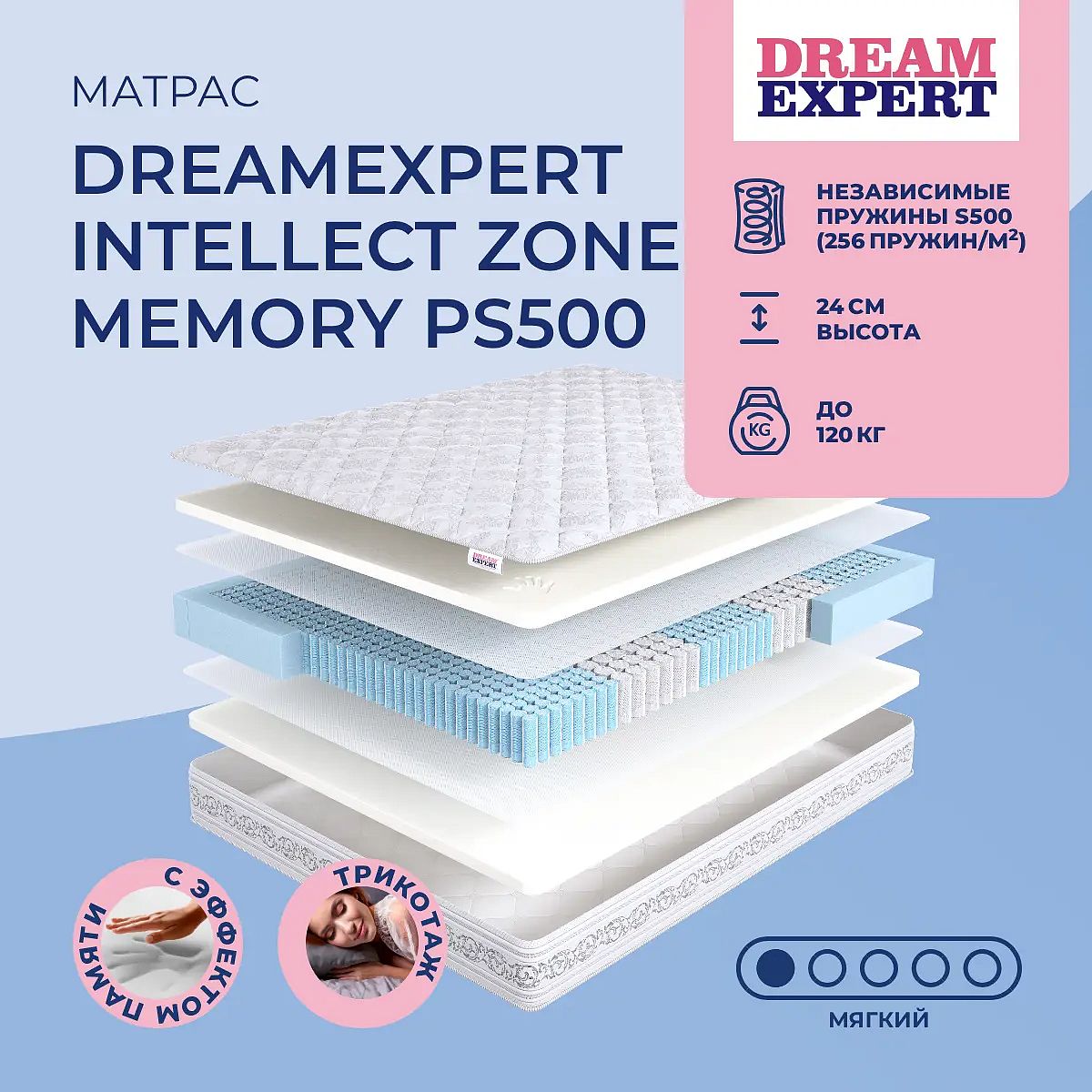 Мягкий матрас «DreamExpert Intellect Zone Memory PS500» отлично подойдет человеку с небольшим весом, предпочитающему высокий уровень комфорта.