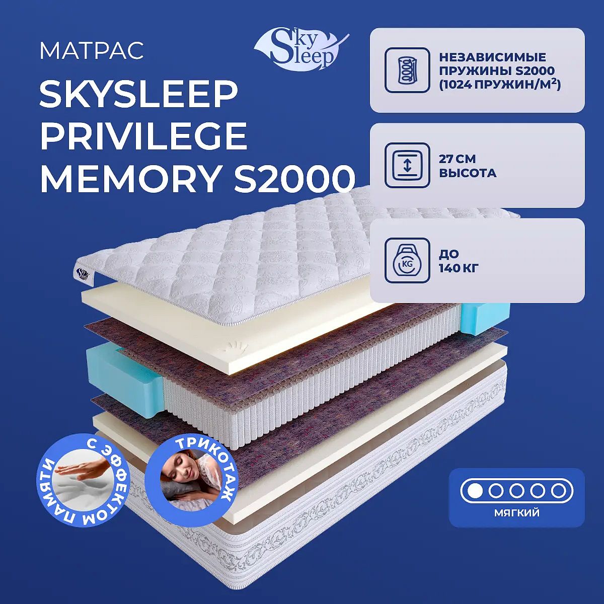 Мягкий матрас «SkySleep Privilege Memory S2000» отлично подойдет человеку с небольшим весом, предпочитающему высокий уровень комфорта.