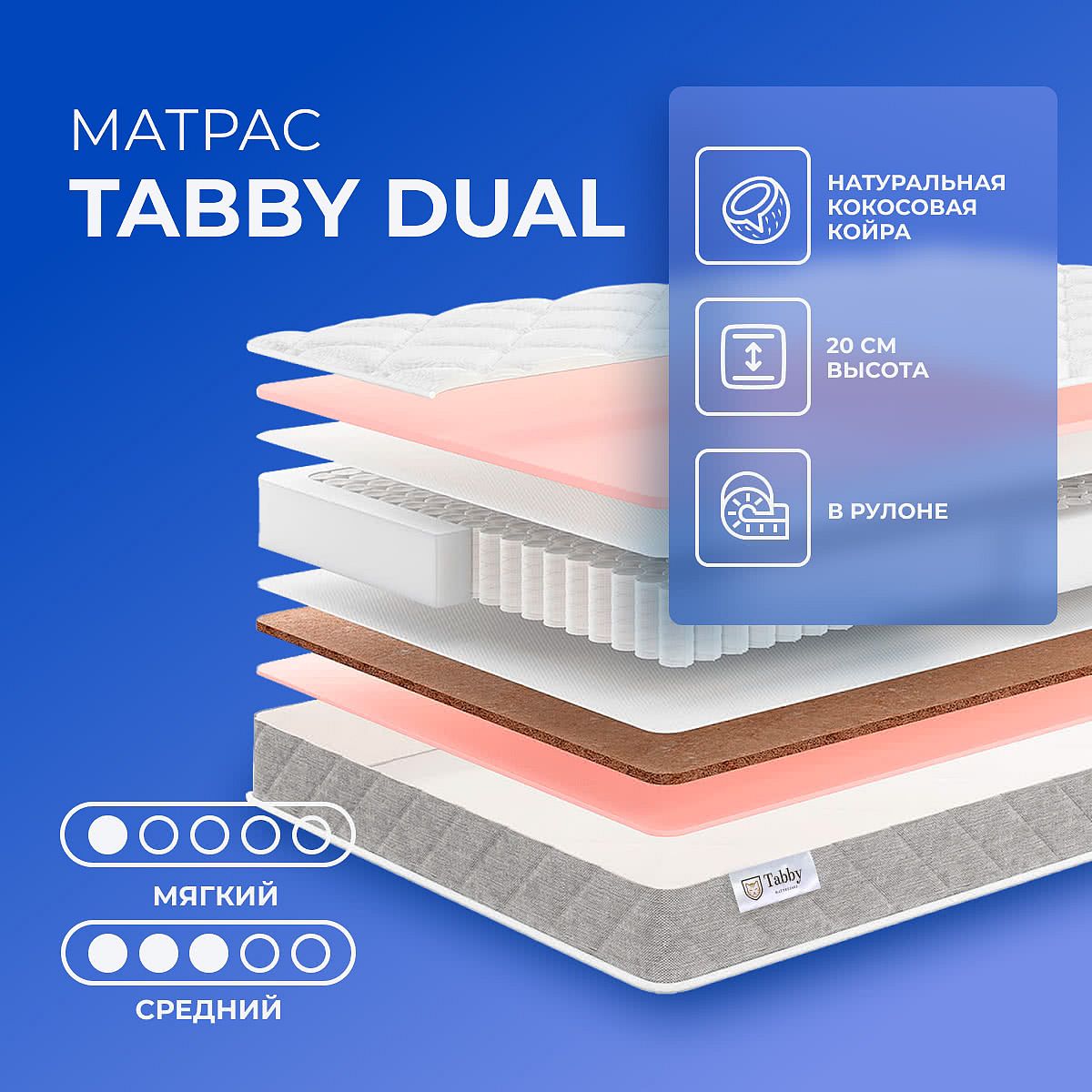 Матрас Tabby Dual — это современный пружинный матрас с двумя сторонами разной жесткости: одна мягкая, другая средней жесткости. Такое решение удобно для тех, кто ценит возможность выбора и хочет подобрать оптимальную поддержку для комфортного сна. Высота матраса составляет 20 см, что обеспечивает достаточную упругость и стабильность на спальном месте. В основе лежит блок независимых пружин с плотностью 256 шт./м2, который помогает равномерно распределять нагрузку и поддерживает тело во время сна. С одной стороны используется пенополиуретан (ППУ) для мягкости, а с другой — сочетание кокосовой койры и ППУ, что делает эту сторону более упругой и средней по жесткости. Матрас выдерживает нагрузку до 110 кг на одно спальное место, подходит для ежедневного использования и обеспечивает необходимый уровень комфорта. Ключевые особенности