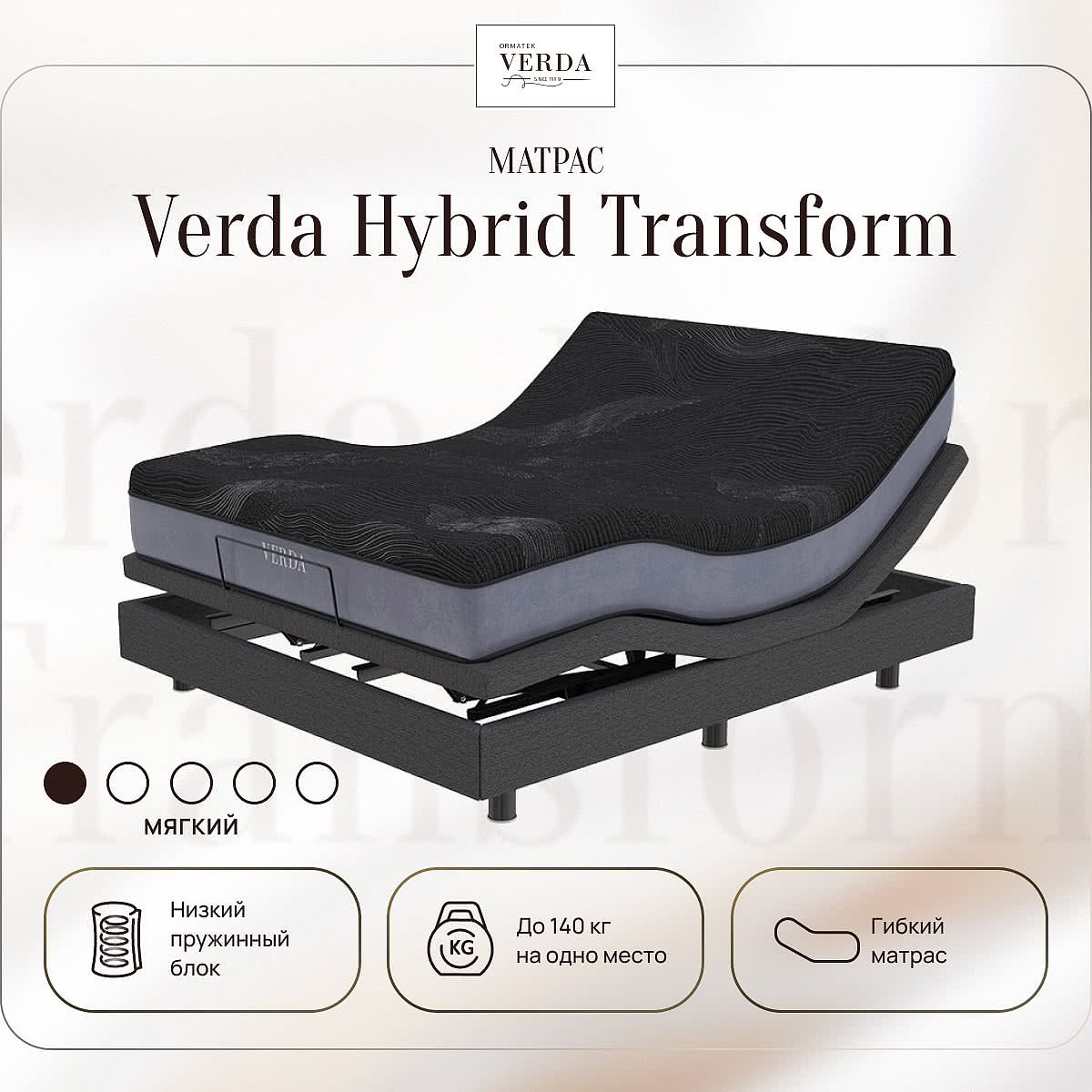 Уровень жесткости: низкий. Максимальная нагрузка на спальное место: до 140 кг. Допустимая разница в весе: до 30 кг. Высота матраса: 26 см. Трансформация матраса Verda Hybrid Transform