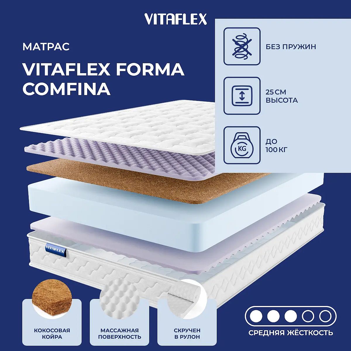 Матрас Vitaflex Forma Comfina — это современный беспружинный матрас средней жесткости, созданный для комфортного сна и ежедневного отдыха. В основе конструкции — сочетание нескольких слоев современных материалов, каждый из которых обеспечивает стабильную поддержку и приятные ощущения. Две стороны матраса отличаются наполнением: с одной стороны используется комбинация RelaxFoam, латексированного кокоса и экопены, с другой — RelaxFoam и экопена. Это позволяет подобрать наиболее удобную сторону для сна, учитывая индивидуальные предпочтения. Чехол выполнен из прочного жаккарда с мягкой стежкой на синтепоне, что придаёт дополнительный комфорт и аккуратный внешний вид. Высокоэластичная экопена равномерно распределяет нагрузку по всему матрасу, а слой кокосовой койры добавляет упругости и воздухопроницаемости. Матрас рассчитан на вес до 100 кг на спальное место и подойдет для большинства стандартных кроватей. Свойства и характеристики