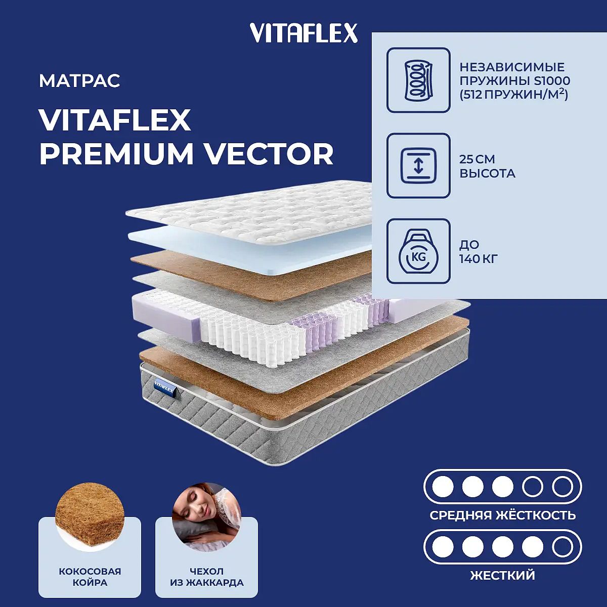 Матрас Vitaflex Premium Vector – это качественный пружинный матрас с разной жесткостью сторон для комфортного сна. Одна сторона матраса средней жесткости благодаря слою высокоэластичной пены (ППУ) толщиной 3 см и латексированному кокосу 1 см, другая – более жесткая, с 3 см слоем латексированного кокоса. Независимый пружинный блок S1000 с плотностью 512 пружин на м2 обеспечивает точечную поддержку тела и рассчитан на нагрузку до 140 кг на спальное место. Высота матраса – 25 см. Чехол выполнен из прочного жаккарда с простежкой на синтепоне (300 г) и дополнен бурлетом из серой рогожки, что придаёт изделию аккуратный внешний вид и дополнительный комфорт. Матрас поставляется в полном размере, не скручен в рулон. Характеристики